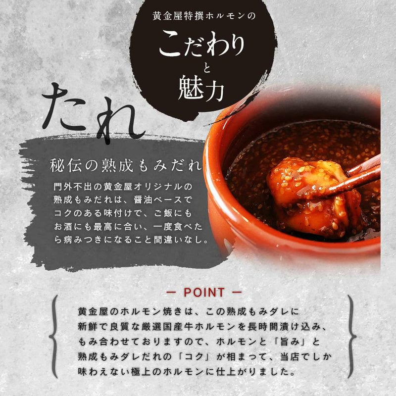 黄金屋のホルモン焼きは、この熟成もみダレに新鮮で良質な厳選国産牛ホルモンを長時間漬け込み、もみ合わせておりますので、ホルモンと「旨み」と熟成もみダレだれの「コク」が相まって、当店でしか味わえない極上のホルモンに仕上がりました。