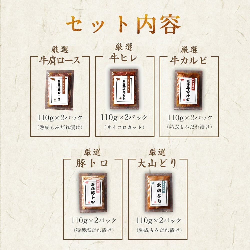 他の画像を見る 琉球焼肉NAKAMA 厳選焼肉5種食べ比べセット×2セット (各110g×2 合計1,1kg / 牛肩ロース / 牛ヒレ / 牛カルビ / 豚トロ / 大山どり) 通常価格 ¥ 10,000 のところ 販売価格 ¥ 10,000 税込 在庫切れ 詳細を見る お気に入りに登録する
